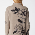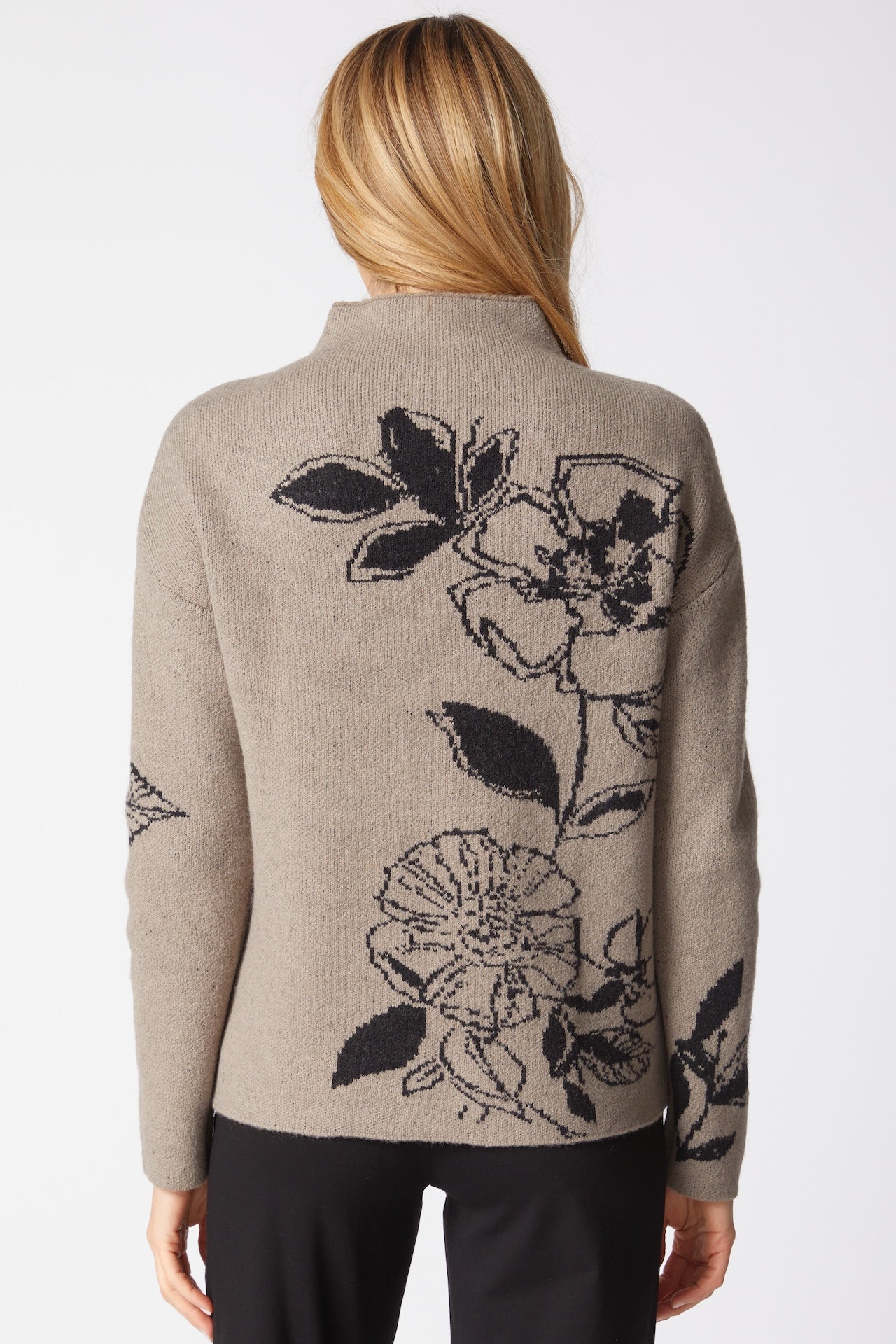 Dramatic floral jacquard pattern in a soft yarn with 3% spandex for comfort and shape retention. Mock neck and relaxed shoulders. An artful style moment.