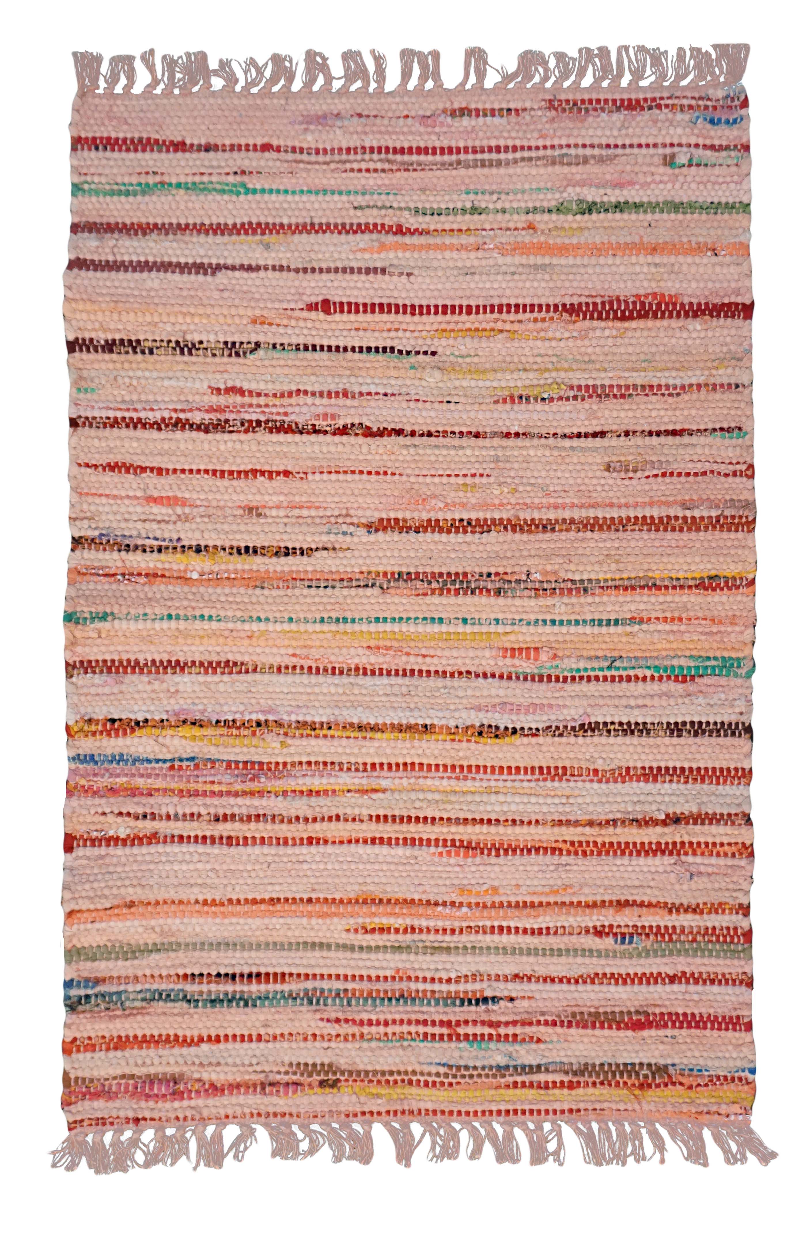 100% Hand-loomed Cotton. These colorful, affordable woven rugs are made from hand dyed cotton rags so slight variations in color may occur.