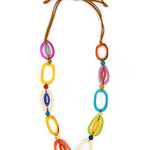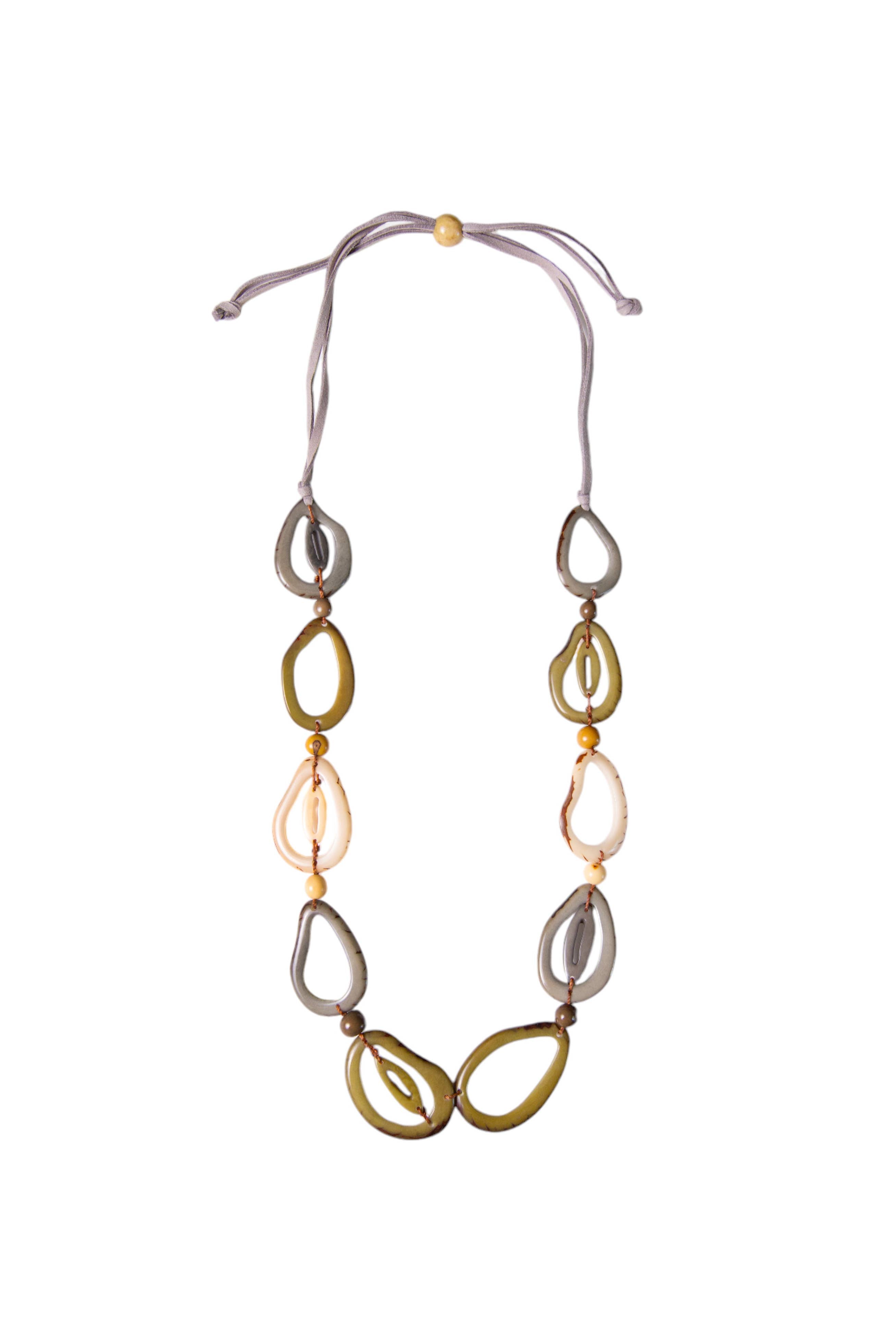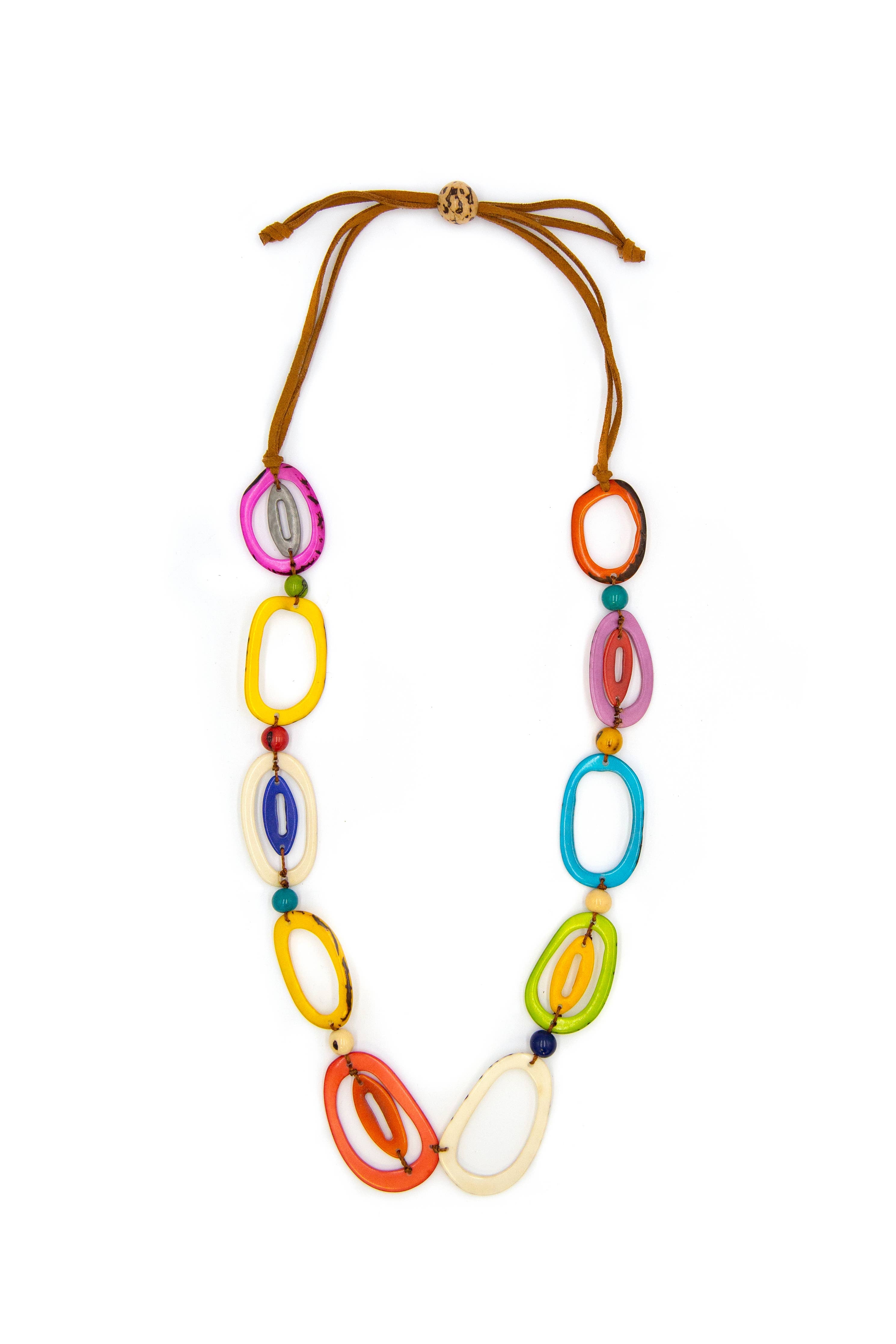 • Adjustable 32-40" L • Lightweight. • Faux leather cord. • Large tagua links. • Organic Vegetable dyes. • Handmade in Ecuador. • Due to the nature and size of tagua nuts, all sizes are approximate…not exact.