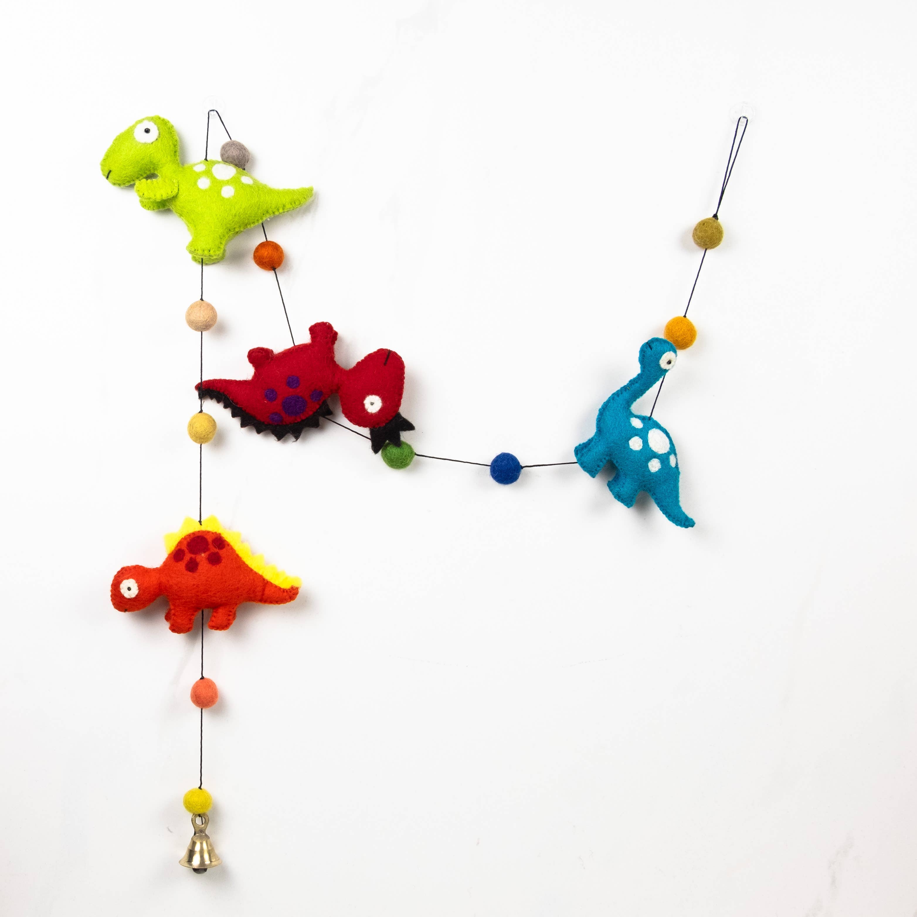 Our whimsical Felt Dinosaur Garlands are handmade with care in Kathmandu, Nepal. Add some cuteness to any room!